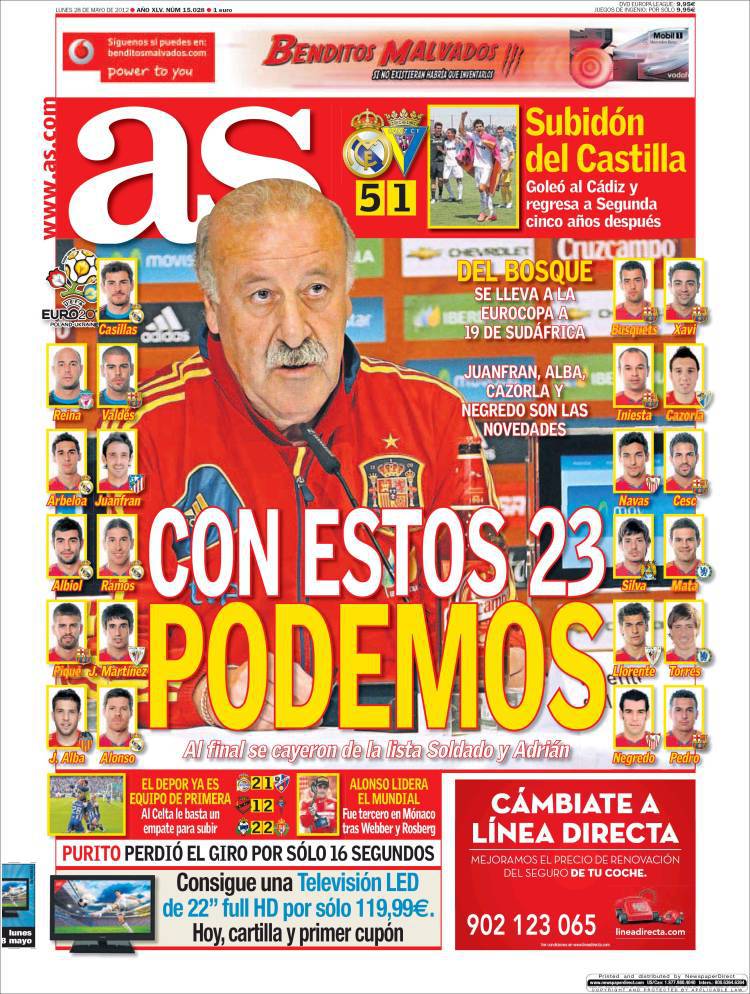 AS CONVOCATI – Sul quotidiano As si parla dei 23 convocati da Del Bosque per l’Europeo di Ucraina e Polonia.