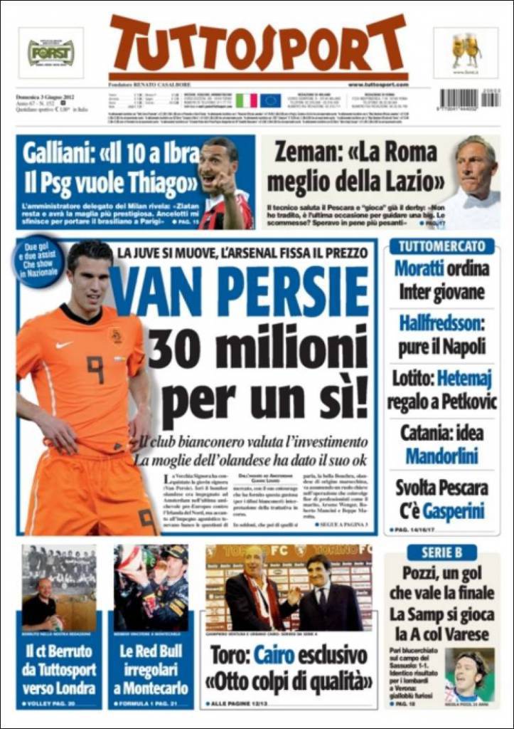 TUTTOSPORT VAN PERSIE 30 MILIONI – L’Arsenal avrebbe messo nero su bianco il prezzo per il cartellino di Robin Van Persie: secondo quanto raccolto da Tuttosport, il cartellino dell’Olandese costerebbe 30 milioni di euro.