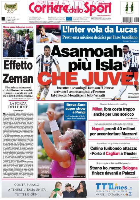 CORRIERE ASAMOAH ISLA JUVENTUS – Sul Corriere dello Sport si parla del mercato Juventus con l’arrivo di Asamoah e Isla a centrocampo.