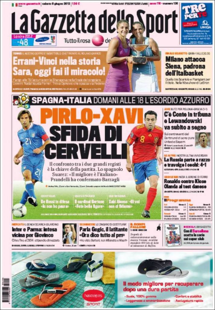 RASSEGNA STAMPA GAZZETTA DELLO SPORT – La prima pagina de La Gazzetta dello Sport è tutta per la sfida di domani tra Italia e Spagna per la prima partita del girone C ad Euro 2012. Grandi protagonisti di una delle partite più affascinanti saranno Andrea Pirlo da una parte e Xavi dall’altra. Non poteva mancare, poi, un flash sull’impresa di ieri del duo Errani-Vinci che hanno trionfato al Roland Garros nel doppio femminile. La Errani, nella finale di oggi, potrebbe centrare una vittoria storica.