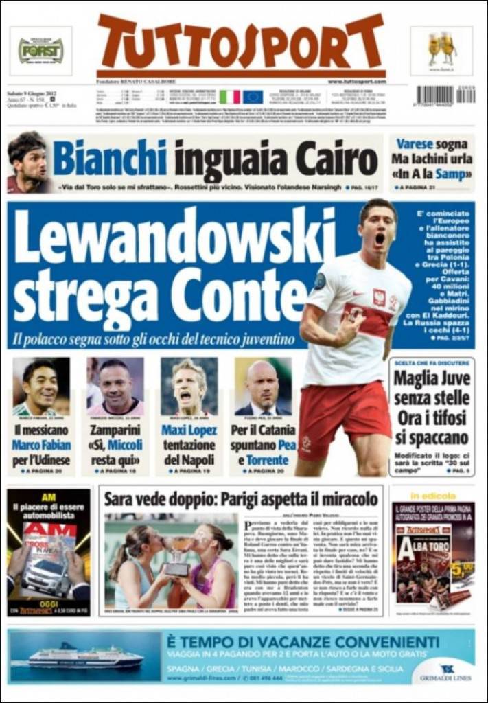 RASSEGNA STAMPA TUTTOSPORT – Il quotidiano di Torino Tuttosport pone l’accento su un nuovo possibile obiettivo per l’attacco della Juventus, il polacco Lewandowski. Nella partita di esordio ad Euro 2012 tra Polonia e Grecia, l’attaccante del Borussia Dortmund si è messo in evidenza sotto gli occhi del tecnico bianconero, Conte. Intanto la società bianconera continua a lavorare su Cavani: presentata un’offerta al Napoli di 40 milioni più Matri. Per finire, non poteva mancare il riferimento alla maglia senza stelle della Juventus per la stagione 2012/2013 che sta spaccando in due l’opinione dei tifosi bianconeri.