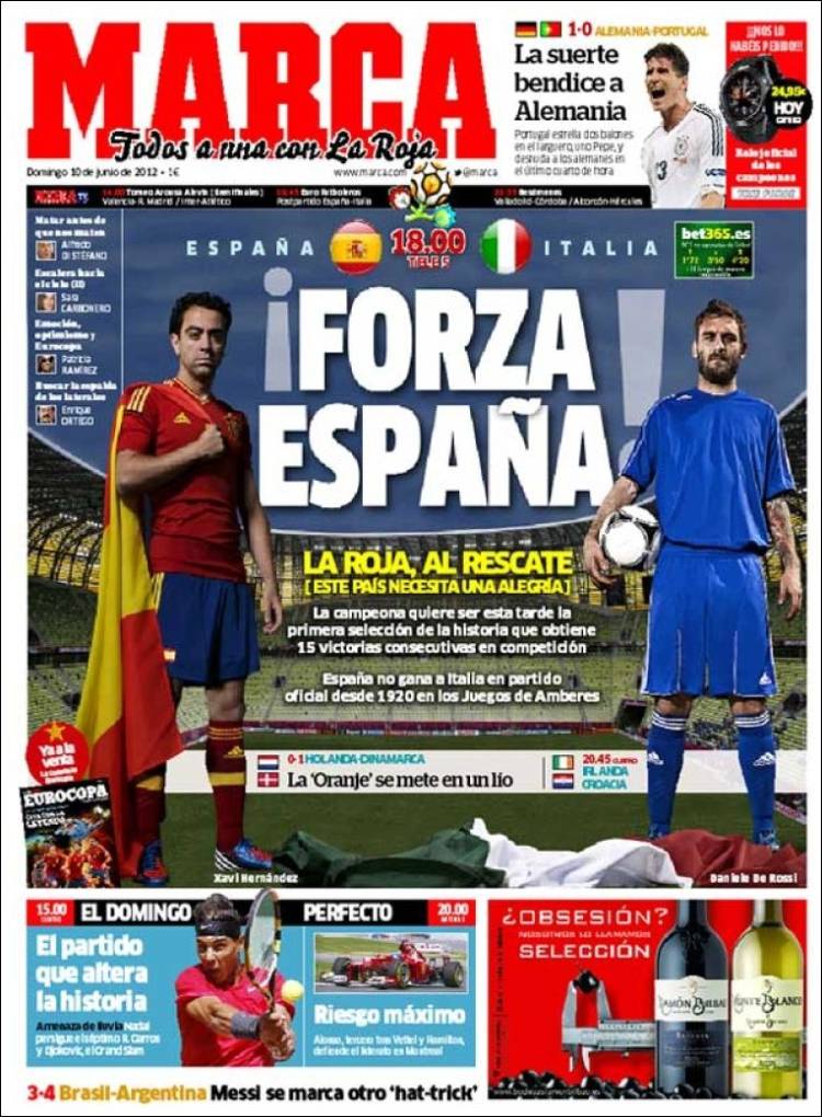 MARCA FORZA SPAGNA – Anche in Spagna c’è attesa spasmodica per l’esordio della nazionale Spagnola, oggi alle 18.00 contro i nostri azzurri a Danzica. Marca con un patriottico “Forza Spagna”, richiama all’orgoglio nazionale.