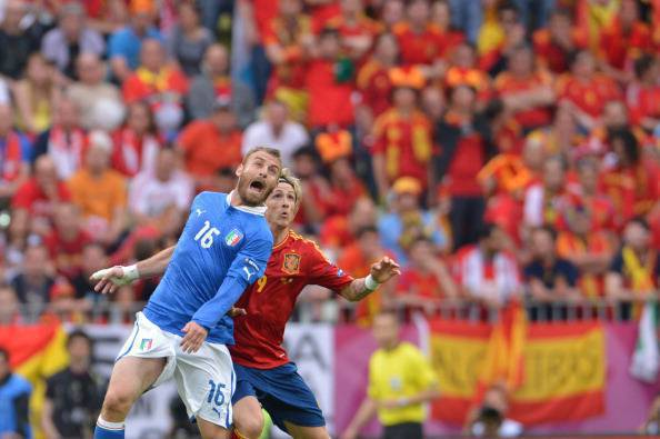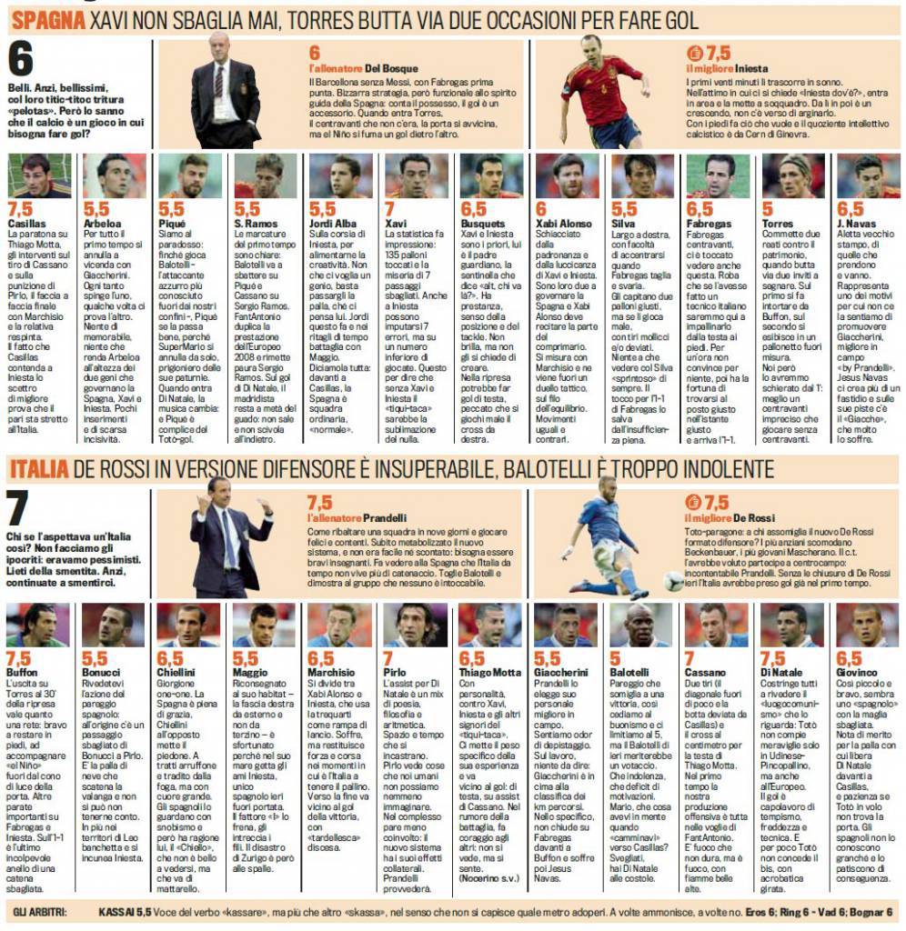 EURO SPAGNA ITALIA VOTI PAGELLE GAZZETTA – Ieri l’Italia di Prandelli ha tenuto testa alla Spagna di Vicente Del Bosque, c.t. spagnolo che ha sorpreso tutti all’inizio schierando Fabregas come finto centravanti. L’Italia ha retto molto bene con un De Rossi super in difesa, ben sorretto da Chiellini. Non bene Bonucci e Giaccherini. Nella Spagna migliore in campo Iniesta autore di un partitone condito da spunti interessanti. Sciagurato Torres che entrato nella ripresa ha sprecato due palle gol colossali. Ecco i voti e le pagelle della Gazzetta dello Sport.