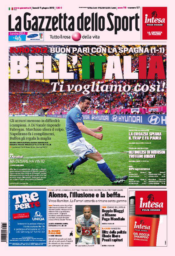 GAZZETTA ITALIA – Sulla Gazzetta dello Sport si parla dell’Italia che pareggia uno a uno contro la Spagna.
