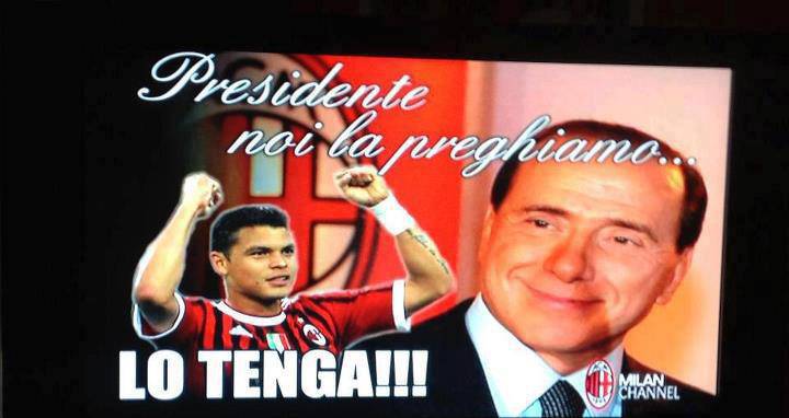 CALCIOMERCATO MILAN THIAGO SILVA PARIS SAINT GERMAIN BERLUSCONI MILAN CHANNEL – La trattativa per il passaggio di Thiago Silva al Paris Saint Germain sta via via arrivando a conclusione ma i tifosi del Milan non si rassegnano a vedere un minimo spiraglio di rottura nelle trattativa e di mantenere il calciatore in maglia rossonera. Anche il canale tematico Milan Channel ha trovato il modo di esprimere il suo parere attraverso un immagine mandata tra i programmi del canale rossonero. Un immagine formata da una foto di Thiago Silva e una del numero uno rossonero Silvio Berlusconi con una scritta che recita: Berlusconi noi lo preghiamo… Lo Tenga!!!!