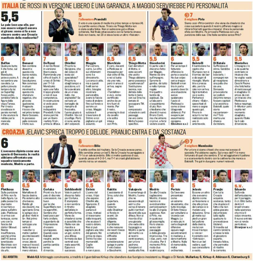 EURO 2012 ITALIA CROAZIA VOTI PAGELLE GAZZETTA – L’Italia non riesce a vincere contro la Croazia e ora nell’ultimo match del girone dovrà battere l’Irlanda e sperare che Spagna e Croazia non pareggino due a due, esattamente come successo otto anni fa nell’Europeo del 2004 tra Svezia e Danimarca. Neanche il vantaggio di Pirlo ci ha permesso di chiudere il match con Balotelli e Cassano poco concreti sotto porta. Così è arrivato il gol di Mandzukic, attaccante croato migliore dei suoi, una doccia fredda per gli azzurri. Erroraccio di Chiellini sul gol croato. Voti e pagelle della Gazzetta dello Sport.