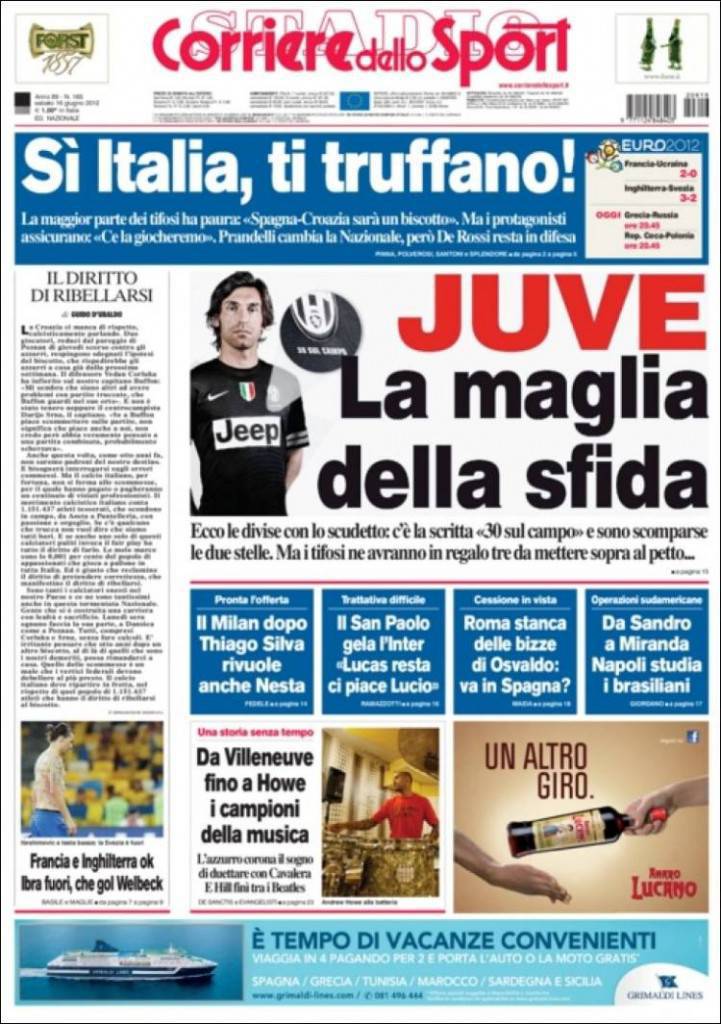 RASSEGNA STAMPA CORRIERE DELLO SPORT JUVENTUS – Apertura del Corriere dello Sport dedicata alla nuova maglia della Juventus con lo scudetto: c’è la scritta “30 sul campo” e sono comparse le due stelle. Ma i tifosi ne avranno in regalo tre da mettere sul petto. Non poteve, poi, mancare, la Nazionale con il primo piano sulla paura che Spagna e Croazia ci possano far fuori. La maggior parte dei tifosi teme che il famoso biscotto del 2004 possa ripetersi ma i protagonisti assicurano: “Ce la giocheremo”. Prandelli cambia la Nazionale ma De Rossi resta in difesa.