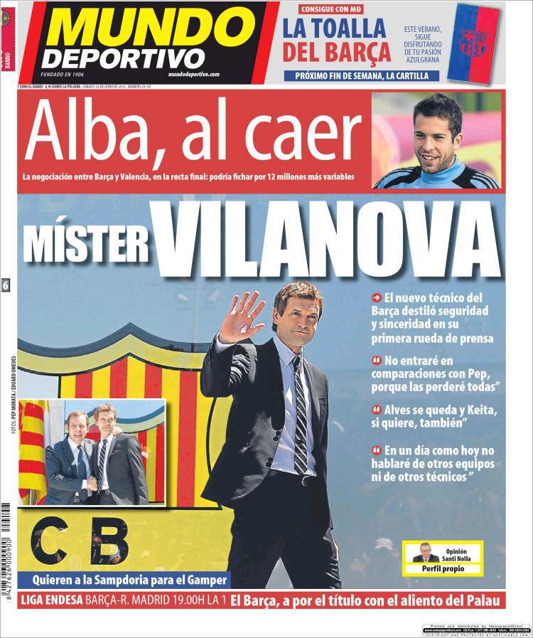 RASSEGNA STAMPA ESTERA MISTER VILANOVA – Prima pagina del Mundo Deportivo dedicata al nuovo tecnico del Barcellona, Vilanova, che si prepara a sostituire l’amato Pep Guardiola. Il nuovo tecnico è stato accolto con entusiasmo dal mondo blaugrana non solo perchè conosce alla perfezione il gioco del Barca essendo stato il vice di Guardiola in questi anni ma anche perchè si è presentato alla stampa im modo sincero e cordiale.