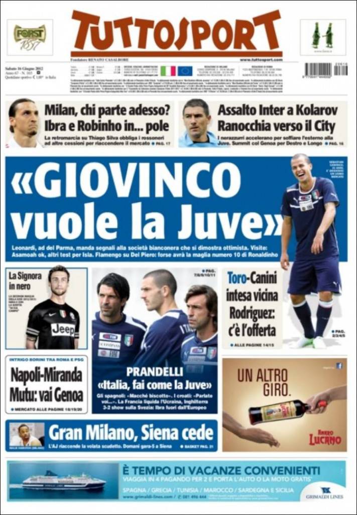 RASSEGNA STAMPA TUTTOSPORT GIOVINCO JUVENTUS – Prima pagina del quotidiano sportivo di Torino dedicato a Sebastian Giovinco e al suo desiderio di tornare alla casa madre della Juventus. Leonardi, ad. del Parma, manda segnali alla Vecchia Signora che si dimostra ottimista. Intanto le visite mediche per Asamoah sono andate a buon fine. Per Mauricio Isla previsti, invece, altri test. Sul fronte mercato, Del Piero verso il Flamengo dove ad attenderlo c’è la maglia numero 10 di Ronaldinho. In casa Milan, dopo il mancato passaggio di Thiago Silva al Psg, Ibrahimovic e Robinho sono i principali indiziati a lasciare la società rossonera. L’Inter, invece, tenta l’assalto a Kolarov mentre Ranocchia viaggia verso il Manchester City. e infine la Nazionale che teme di essere fatta fuori dagli spagnoli e dai croati. La Spagna, però, assicura che non c’è alcun rischio mentre i croati ci bacchettano: “Parlate voi che avete avuto lo scandalo del calcioscommesse”.