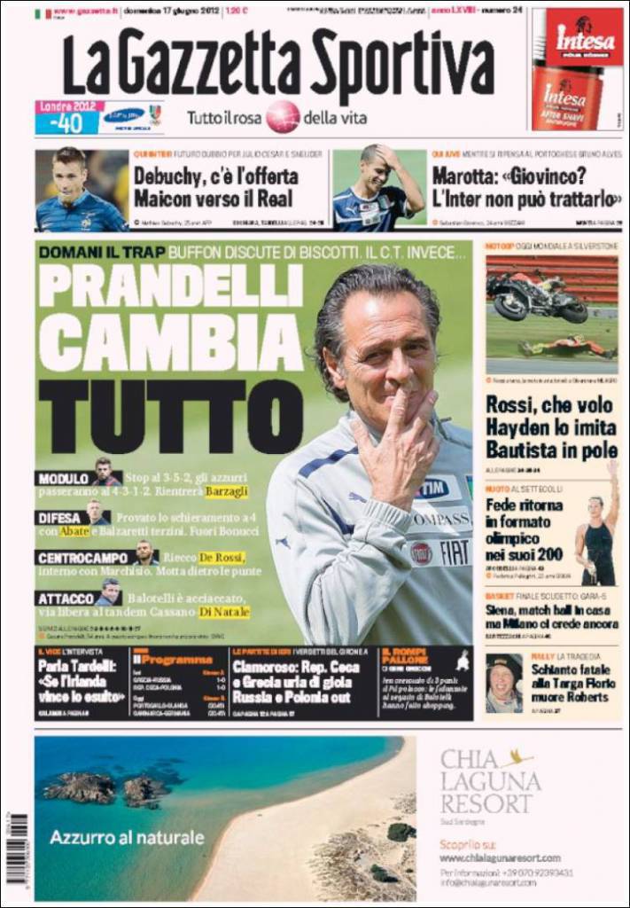 GAZZETTA DELLO SPORT PRANDELLI CAMBIA TUTTO – Cesare Prandelli, secondo quanto riportato dalla Gazzetta dello Sport stamani, starebbe pensando di rivoluzionare la squadra che affronterà l’Irlanda: difesa a 4 e centrocampo a 3 contro il team allenato da Trapattoni.