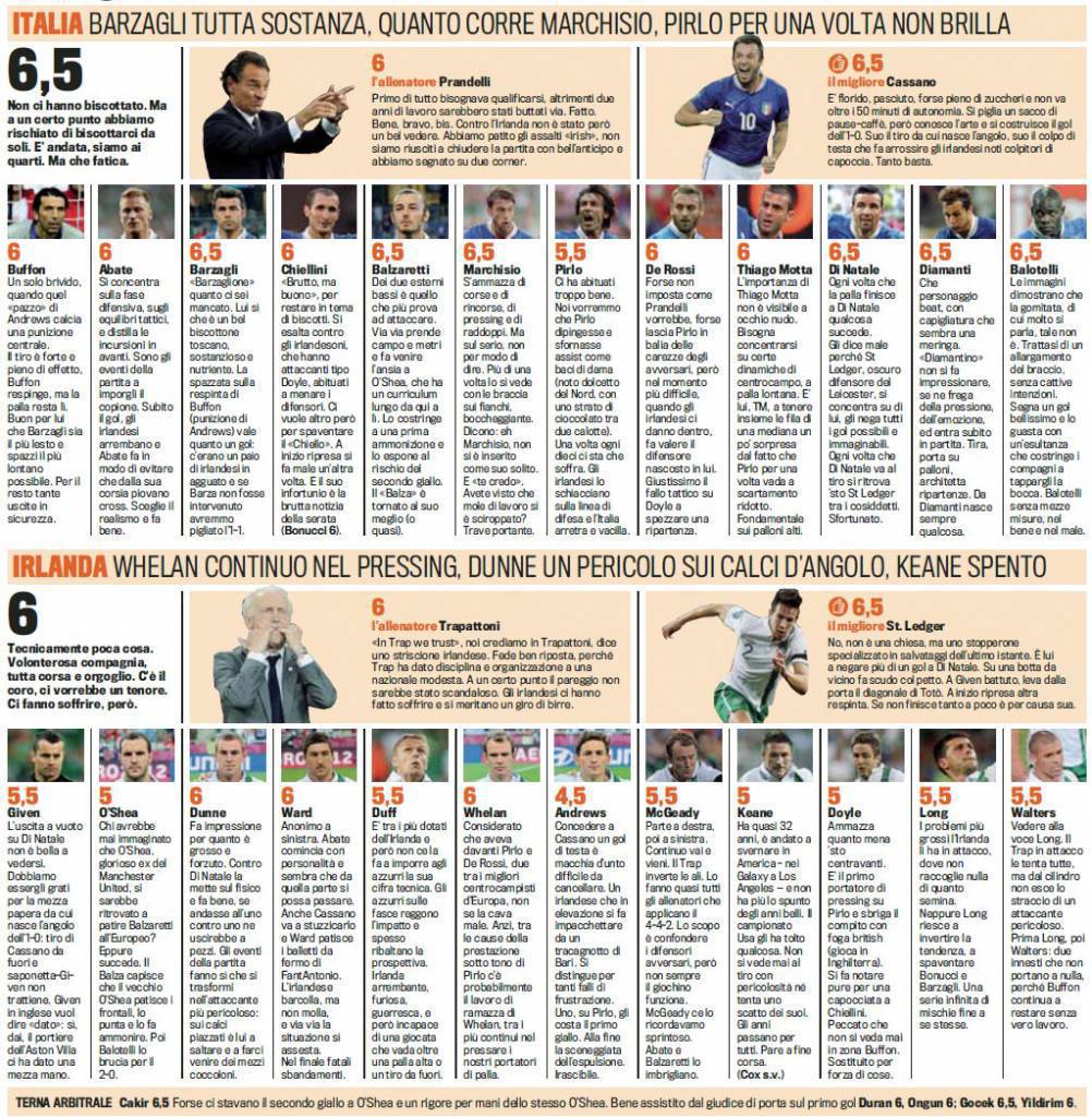 ITALIA IRLANDA VOTI PAGELLE GAZZETTA DELLO SPORT – Meglio di così, difficilmente all’Italia poteva finire dopo ieri sera. Un due a zero che rialza notevolmente le speranze azzurre che, adesso, possono buttarsi anima e corpo sulla preparazione del quarto di finale. I due bad boys, Cassano e Balotelli, hanno deciso una partita che era iniziata davvero male per gli uomini di Prandelli che male interpretavano nei primi 25 minuti il cambio di modulo. Non ci resta adesso che leggere i voti e le pagelle del match di ieri sera tra Italia ed Irlanda, pagelle della Gazzetta dello Sport.