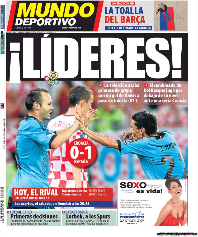 MUNDO DEPORTIVO LEADER – Il quotidiano Spagnolo, Mundo Deportivo, celebra il primo posto della nazionale iberica, uscita vincitrice ieri dallo scontro con la Croazia, grazie ad un gol nei minuti finali di Jesus Navas.