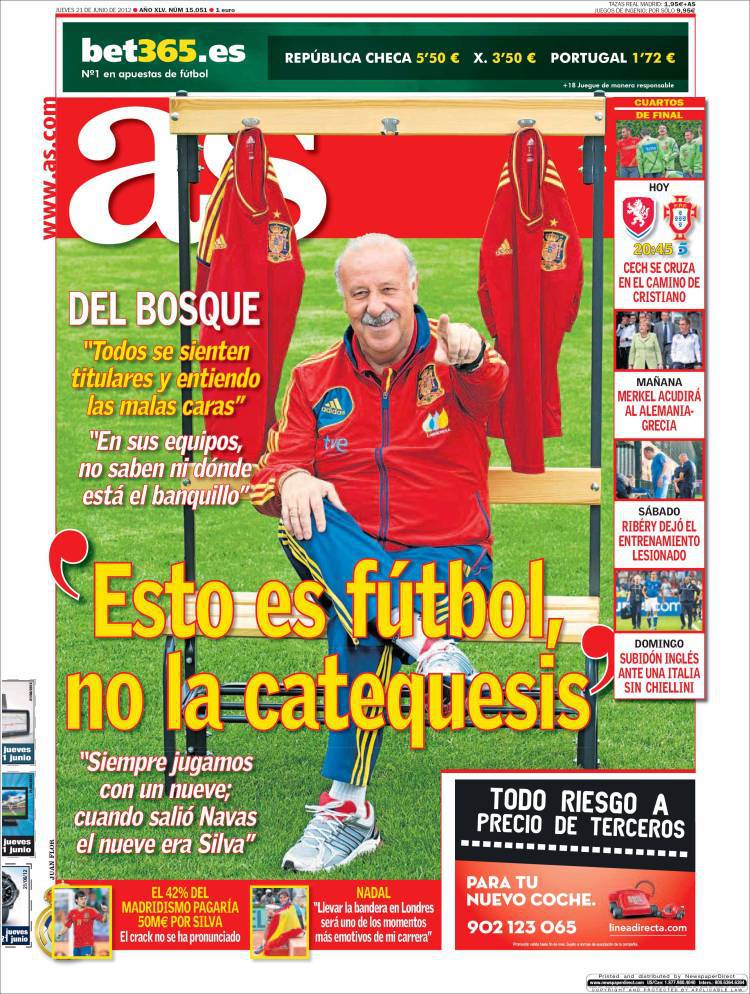 AS QUESTO E’ CALCIO CATECHESI – Prima pagina del quotidiano spagnolo As, che si apre con le parole di Vincente Del Bosque, tecnico della squadra Iberica.
