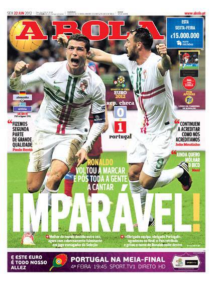 A BOLA INARRESTABILE – Grandi festeggiamenti in Portogallo per l’approdo in semifinale: per i suoi compatrioti, Cristiano Ronaldo, è il vero messia del calcio. A Bola, gli dedica la prima pagina: inarrestabile Cristiano!