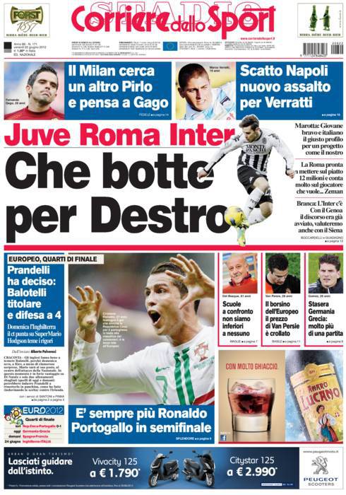 CORRIERE DELLO SPORT BOTTE DESTRO – Attacco triplo per Mattia Destro, attaccante in compartecipazione tra Siena e Genoa che, come riportato dal Corriere dello Sport, è richiesto da Juventus, Inter e Roma.