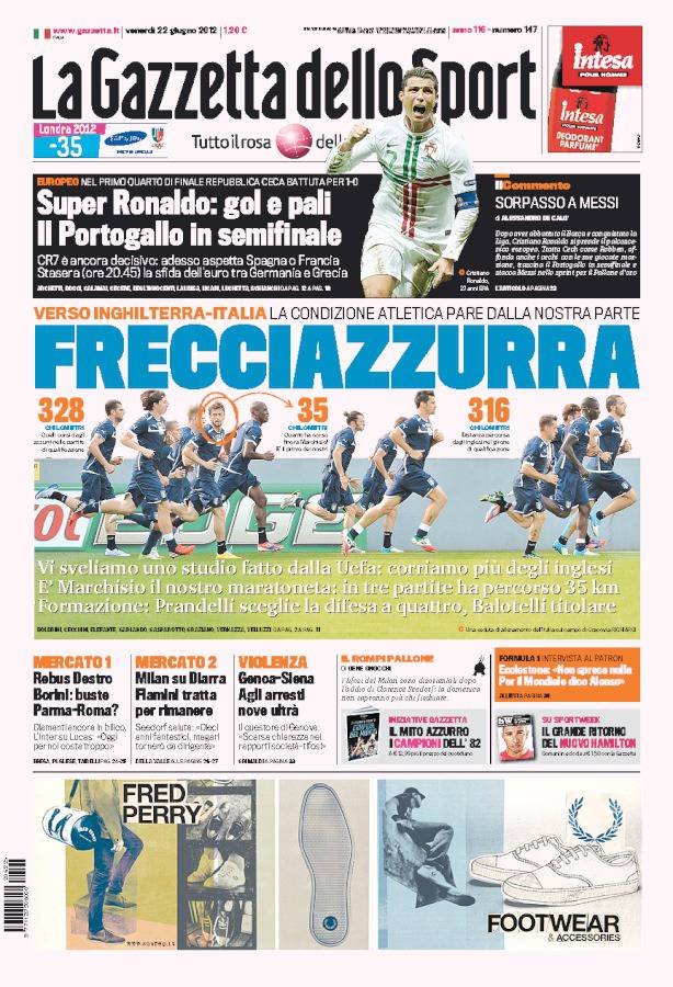 GAZZETTA DELLO SPORT FRECCIAZZURRA – Sembra davvero essere in ottime condizioni di salute la nazionale Italiana che, domenica, sfiderà nell’Europeo di Polonia ed Ucraina l’Inghilterra, nella partita valevole per i quarti di finale. Analisi della condizione fisica azzurra, nella prima pagina della Gazzetta dello Sport.