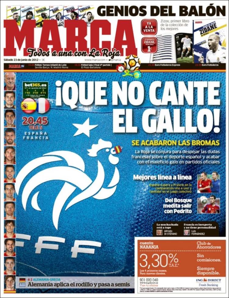MARCA FRANCIA SPAGNA – L’apertura scherzosa del quotidiano spagnolo Marca è riferita alla sfida di questa sera tra Francia e Spagna. I tifosi spagnoli sperano che queste sera il “Gallo” francese non canti vittoria alla fine dei 90 o più minuti.