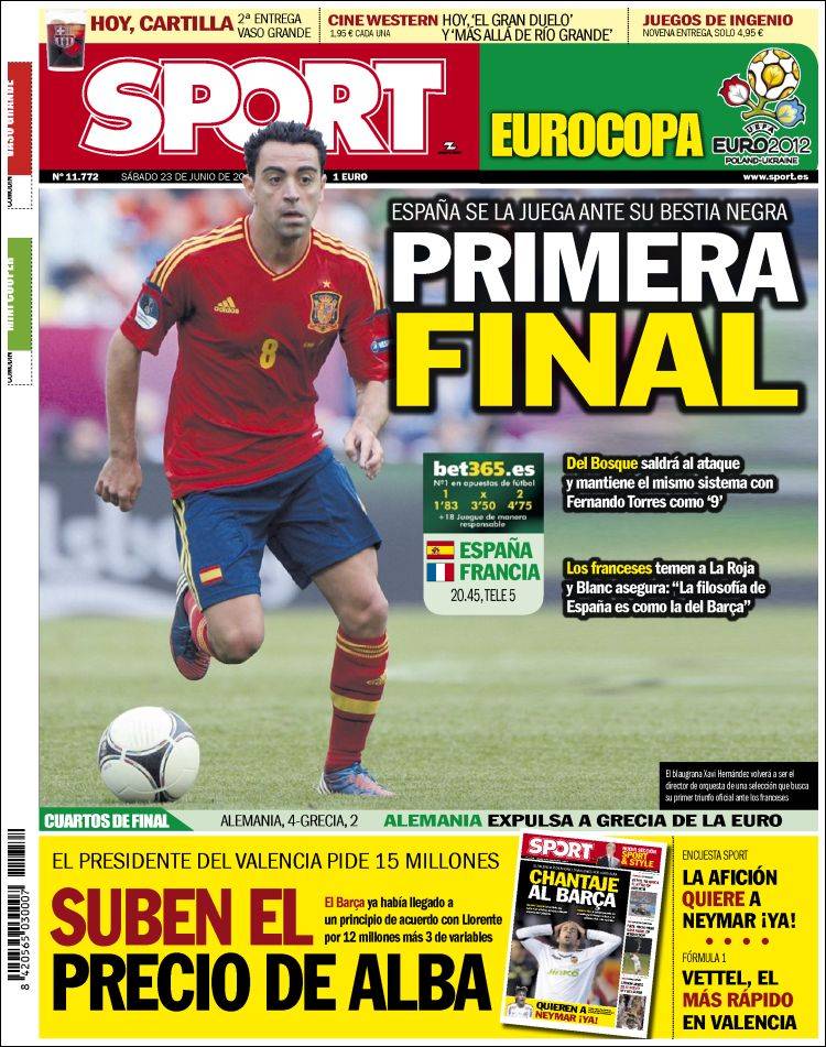 SPORT FRANCIA SPAGNA EURO 2012 QUARTI DI FINALE – Non si parla di mercato nelle prime pagine dei quotidiani spagnoli ma si pensa ad incitare la Roja che questa sera alle ore 20.45 scenderà in campo contro la Francia per i quarti di finale di Euro 2012. Il quotidiano Sport parla di Prima Finale per gli uomini di Del Bosque.