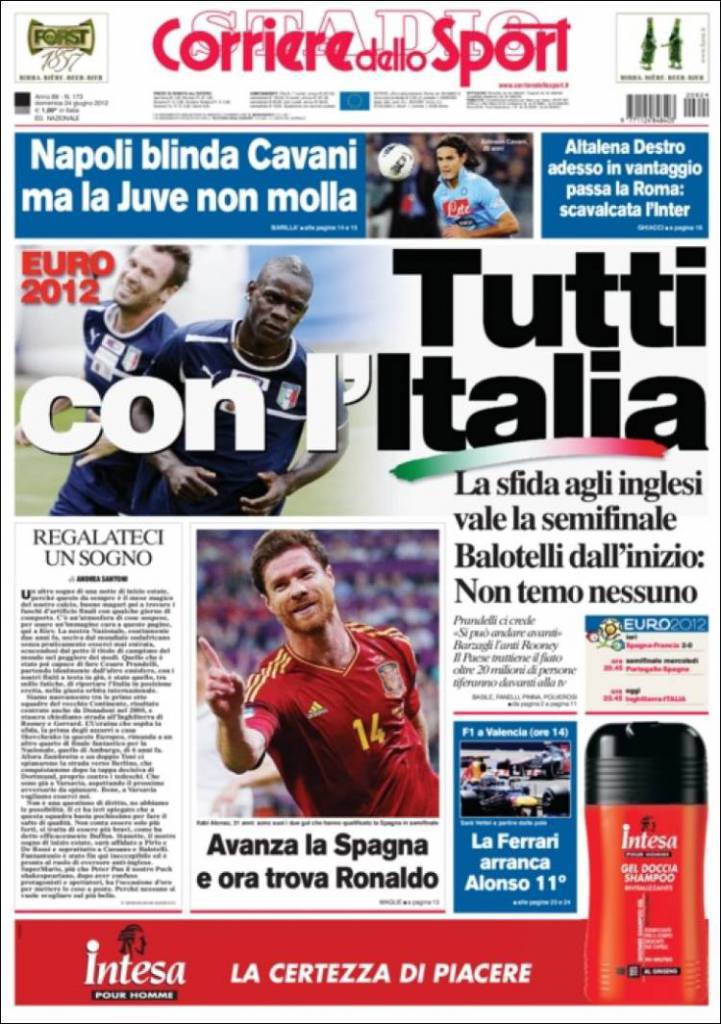 CORRIERE DELLO SPORT ITALIA – Un solo grido oggi accomunerà tutti gli italiani: forza azzurri. Tutti incollati alla tv per supportare gli uomini di Prandelli, alla difficile sfida contro l’Inghilterra.