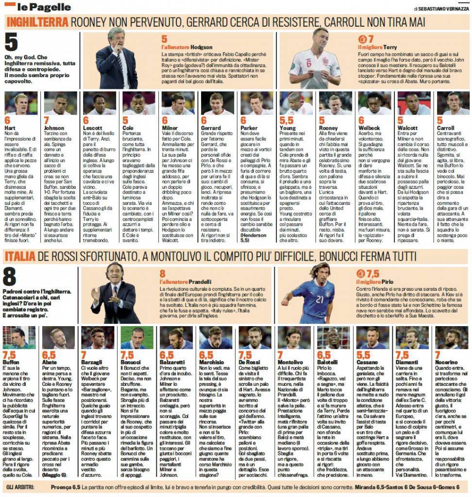ITALIA INGHILTERRA EURO2012 VOTI PAGELLE GAZZETTA – L’Italia batte l’Inghilterra ai rigori nei quarti di finale dell’Europeo 2012. Gli azzurri volano in semifinale dopo un match giocato benissimo contro gli inglesi che hanno impensierito Buffon solo nel primo tempo con un tiro di Johnson smanacciato dal portiere italiano. Per tutto il resto della partita è dominio Italia con due pali colpiti. Gli azzurri hanno dimostrato maggiore grinta e soprattutto freschezza atletica. Fantastico Pirlo, autore di un match fenomenale con tanto di cucchiaio annesso durante i rigori. Benissimo anche De Rossi, Diamanti e la difesa. Voti e pagelle della Gazzetta dello Sport.