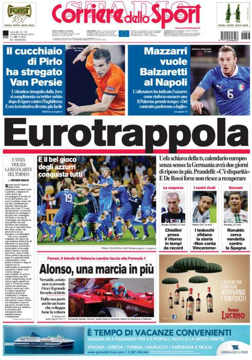 CORRIERE DELLO SPORT EUROTRAPPOLA – Due giorni di riposo in meno per l’Italia, peseranno sul match contro la Germania? Cesare Prandelli si è lamentato proprio del calendario stilato dall’Uefa…