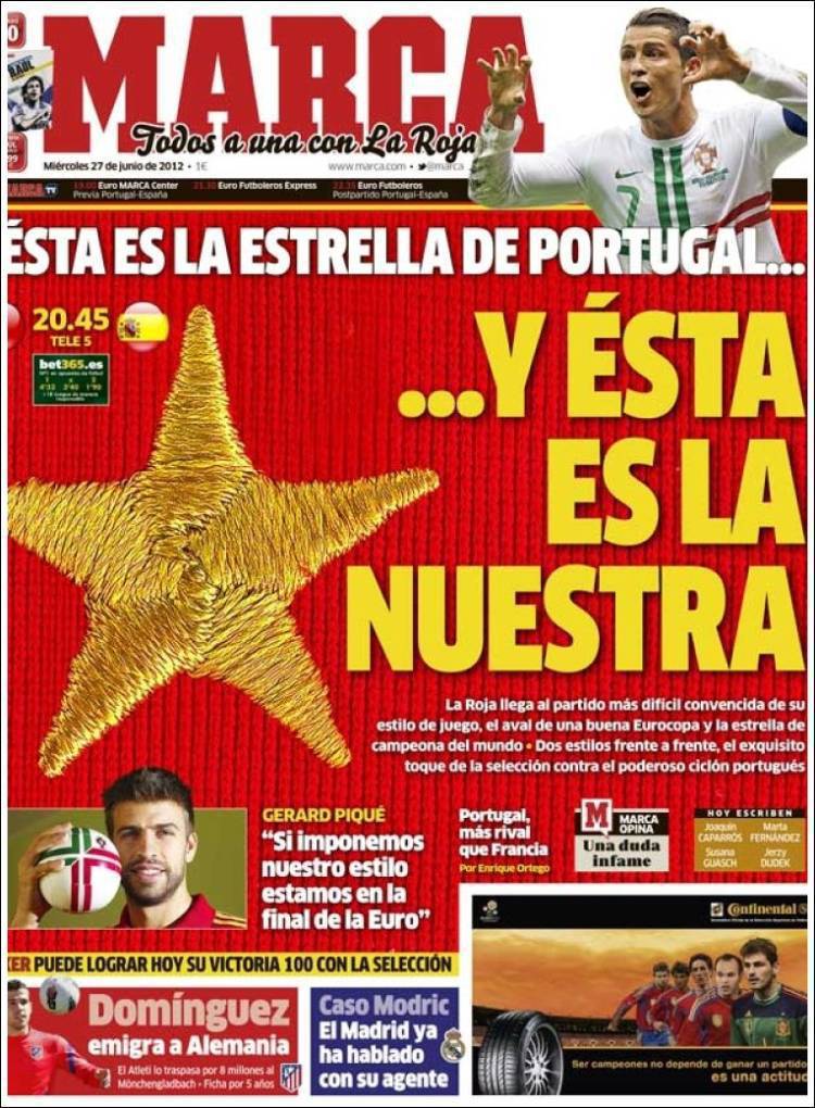 MARCA RONALDO – Il quotidiano Marca parla del match di questa sera Spagna e Portogallo nella prima semifinale dell’Europeo.