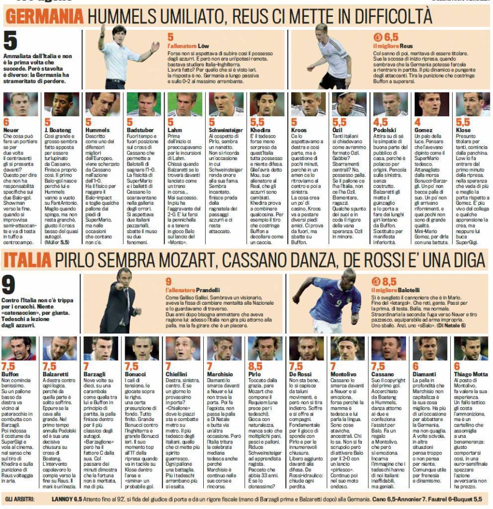 GERMANIA ITALIA VOTI PAGELLE GAZZETTA DELLO SPORT – Ammettiamolo pure: nessuno ha mai creduto fino in fondo a questa Nazionale. Dopo la disastrosa sconfitta contro la Russia, la maggior parte degli italiani era convinta che saremmo tornati subito a casa. E invece Cesare Prandelli ha fatto il miracolo. E’ lui in vero genio di questa Nazionale: ha ridato entusiasmo, unità e senso del gruppo a questa squadra. E la grande vittoria di ieri sera contro la Germania ne è la prova. Due giganti su tutti: Andrea Pirlo e Mario Balotelli, due alieni, due mostri. E con loro tutti gli altri. A partire dalla difesa che ha alzato un muro e a Daniele De Rossi, sempre un gigante in mezzo al campo anche quando sembrava che non dovesse farcela. E ora sotto con la Spagna.
