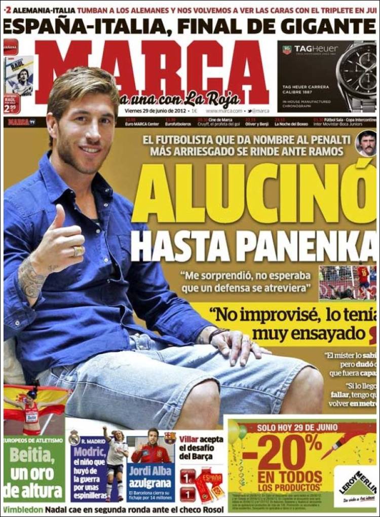 RASSEGNA STAMPA MARCA SPAGNA ITALIA – La finale di domenica sarà tra Spagna e Italia. Gli spagnoli sono sicuri di batterci e conquistare così il terzo titolo consecutivo dopo quelli di Euro 2008 e dei Mondiali 2010. La grande vittoria per gli spagnoli e vedere a casa i tedeschi che continuano a dettarci regole.
