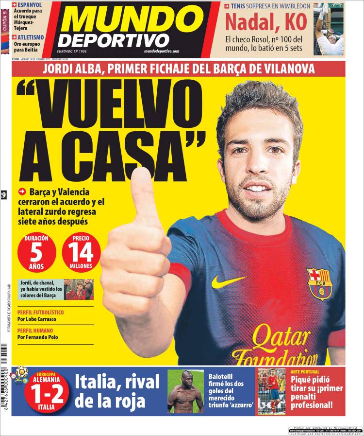 RASSEGNA SPAMPA JORDI ALBA BARCELLONA VILANOVA – Il Mundo Deportivo dà risalto al primo acquisto del Barcellona della nuova era di Tito Vilanova. Barca e Valencia hanno trovato l’accordo per la cessione di Jordi Alba sulla base di 14 milioni. Il giocatore ha firmato un contratto quinquennale.