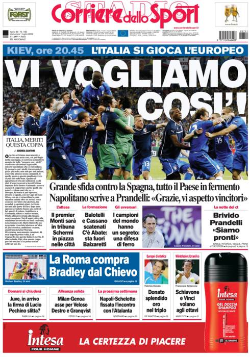 RASSEGNA STAMPA CORRIERE DELLO SPORT ITALIA – Apriamo la consueta rassegna stampa con il Corriere dello Sport, che, come prevedibile, dedica la prima pagina all’attesissima sfida tra Italia e Spagna. Appuntamento questa sera alle 20.45, quando le due squadre scenderanno in campo a Kiev per la finale di EURO 2012. In palio c’è un posto in paradiso, per due nazionali che rappresentano due paesi che stanno facendo i conti con la crisi. Per questo la posta in gioco è doppia. Parte favorita la Spagna che, già prima dell’inizio di questa competizione, veniva data come una delle più accreditate a vincere questi Europei.