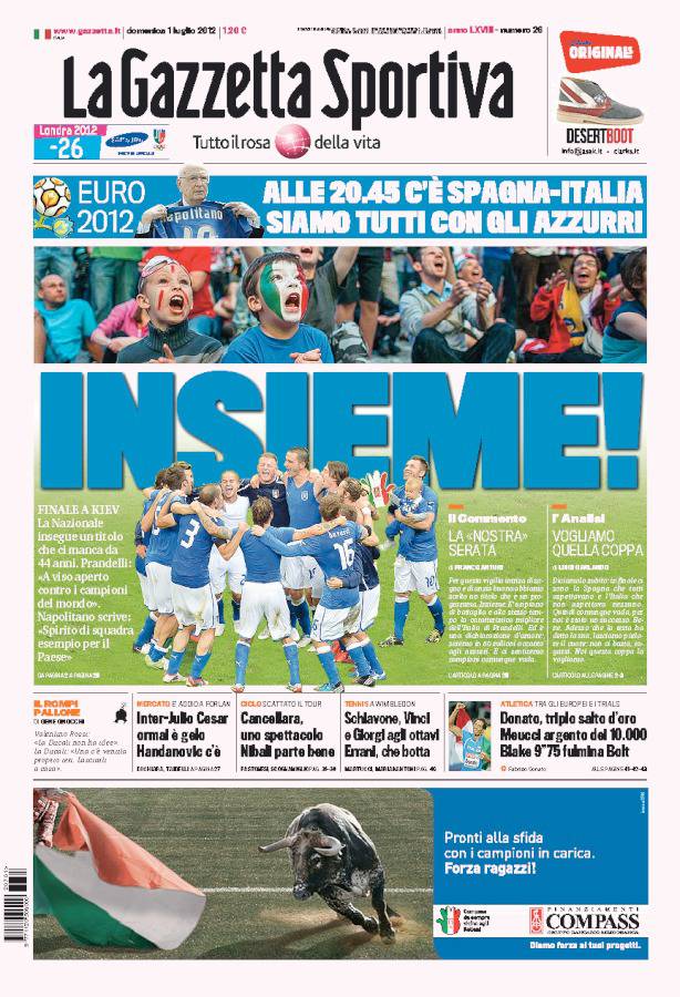 RASSEGNA STAMPA GAZZETTA DELLO SPORT ITALIA – Diciamolo subito: in finale ci sono la Spagna che tutti aspettavano e l’Italia che non aspettava nessuno. Quindi comunque vada, per noi è stato un successo. Bene. Adesso che la testa ha detto la sua, lasciamo parlare il cuore: non ci basta, ragazzi. Noi questa coppa la vogliamo perché ci manca da 44 anni, perché è stato così bello avvicinarla che sarebbe un peccato non sollevarla, perché ce la meritiamo, perché possiamo, perché gli italiani soffocati da Caronte aspettano un pretesto per tuffarsi nelle fontane. Ecco come apre oggi la Gazzetta dello Sport.