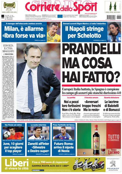 CORRIERE PRANDELLI – Sul Corriere dello Sport arrivano accuse al c.t. Prandelli per la gara di ieri, la finale dell’Europeo persa quattro a zero contro la Spagna.