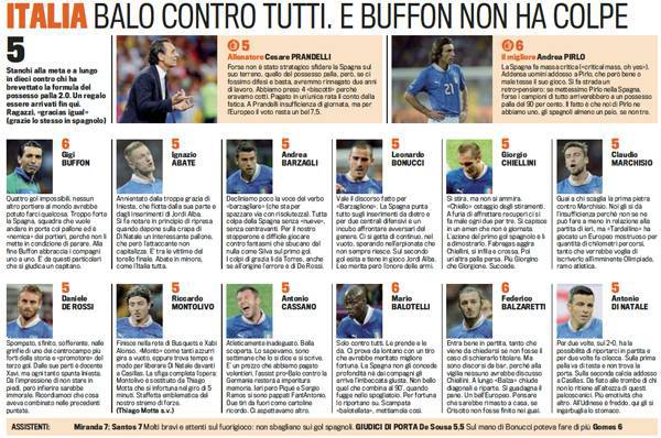 EURO 2012 ITALIA SPAGNA VOTI PAGELLE GAZZETTA FOTO – La Spagna annichilisce l’Italia battendola quattro a zero nella finale dell’Europeo. I giocatori spagnoli troppo forti per gli italiani, a centrocampo comanda Xavi coadiuvato da Iniesta e Xabi Alonso. Sulla fascia sinistra Jordi Alba assolutamente imponente con la sua progressione che ha lasciato di sasso i giocatori italiani. Nell’Italia si salvano solo Pirlo, Balotelli, Balzaretti e Buffon. Male gli altri giocatori in particolare il centrocampo. Prandelli sbaglia qualcosa ma alla fine va bene così. Voti e pagelle della Gazzetta dello Sport.