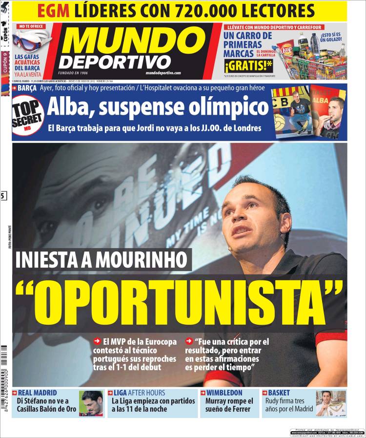 MUNDO DEPORTIVO INIESTA MOURINHO – Iniesta ha dato dell’opportunista a Mourinho dopo che lo Special One aveva criticato la Spagna nell’uno a uno contro l’Italia.