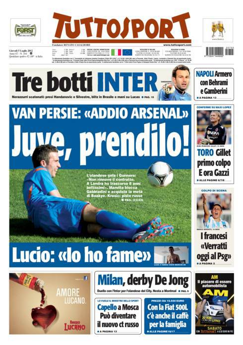 TUTTOSPORT JUVENTUS – Su Tuttosport si parla di Van Persie, attaccante olandese, che ha deciso di non rinnovare il contratto con l’Arsenal.