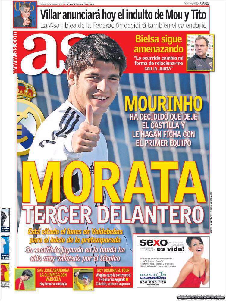 AS MORATA – Sul quotidiano As si parla di Morata, attaccante del Castilla, che verrà promosso da Mourinho in prima squadra.