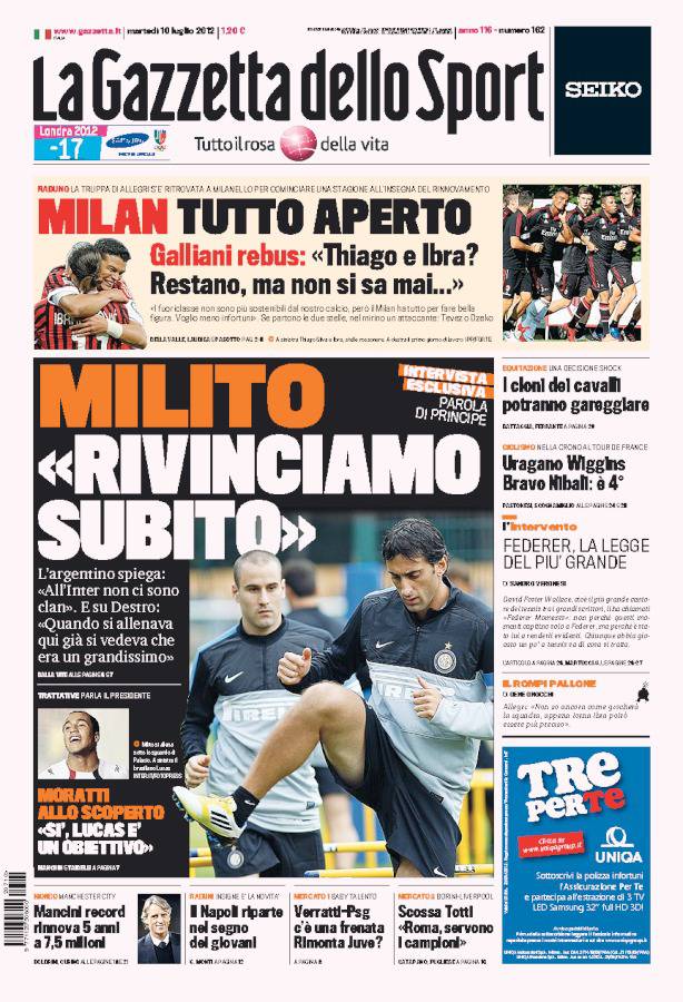 GAZZETTA MILITO – Sulla Gazzetta dello Sport intervista a Diego Milito, attaccante dell’Inter.