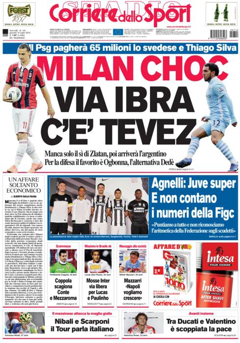 CORRIERE MILAN IBRAHIMOVIC TEVEZ – Sul Corriere dello Sport si parla del Milan che è pronto a cedere Ibrahimovic e a prendere Tevez.