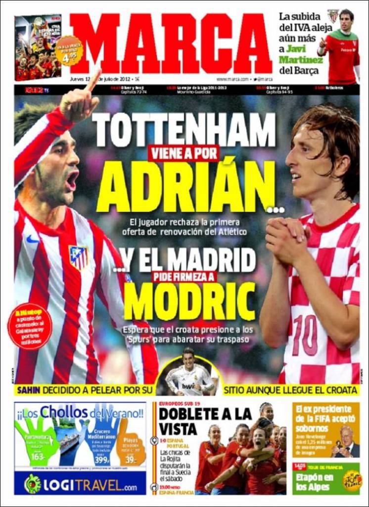 MARCA TOTTENHAM ADRIAN REAL MADRID MODRIC – Il quotidiano Marca parla degli affari di mercato tra i due club di Madrid.