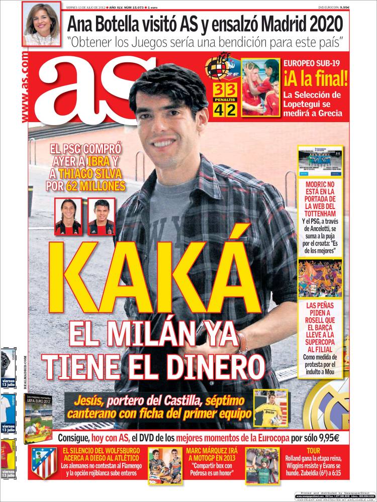 AS KAKA’ MILAN – Sul quotidiano As si parla di Kakà che potrebbe tornare al Milan visto che i rossoneri hanno incassato 62 milioni di euro.