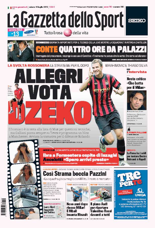 GAZZETTA ALLEGRI DZEKO – Sulla Gazzetta dello Sport si parla di Dzeko che è il candidato numero uno per sostituire Ibrahimovic.