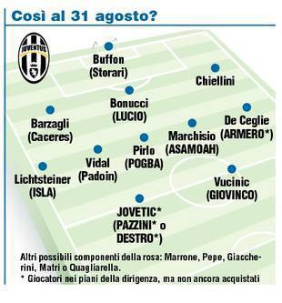 CALCIOMERCATO JUVENTUS FOTO – E’ senza dubbio la società italiana più attiva sul mercato e anche quella che si è rinforzata di più fino a questo momento. Stiamo parlando della Juventus, che nelle prossime settimane potrebbe rinforzare il reparto avanzato per chiudere così la campagna acquisti di questa estate. Come si evince dalla foto di Tuttosport, la difesa titolare sarà quella vista all’opera in questa stagione. Per il centrocampo ci sono invece nove giocatori (dieci se arriverà Armero) più o meno dello stesso livello a disposizione di Conte. Infine in attacco resta da vedere chi arriverà per affiancare Vucinic.