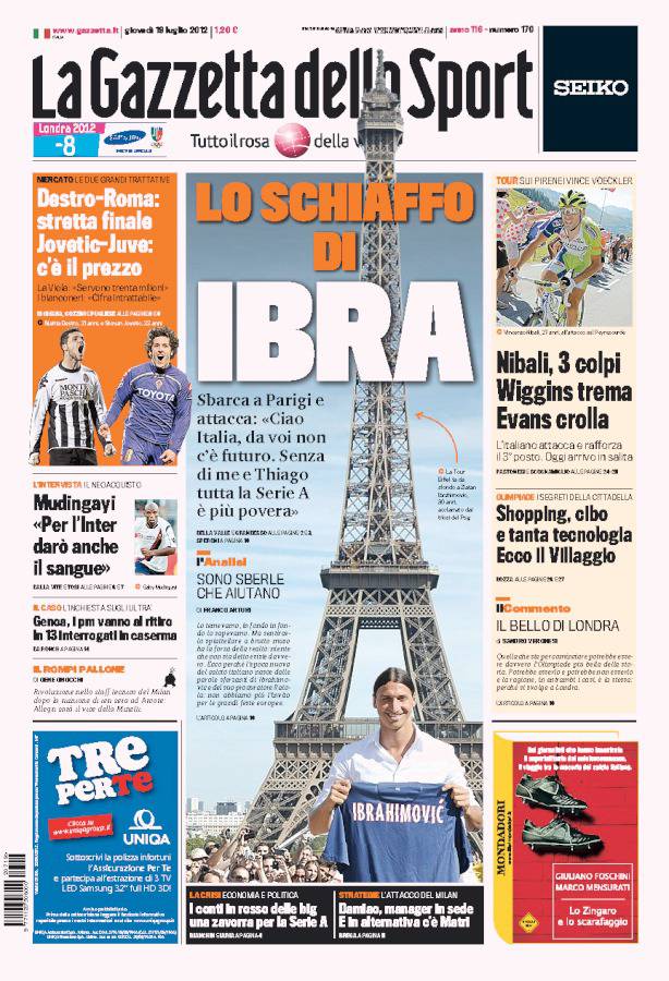 GAZZETTA IBRAHIMOVIC – Sulla Gazzetta dello Sport si parla di Zlatan Ibrahimovic che ieri durante la presentazione con la maglia del Psg ha parlato di un campionato italiano più povero.