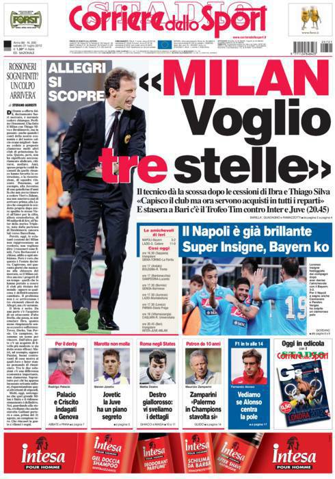 CORRIERE MILAN ALLEGRI – Sul Corriere dello Sport parla Allegri che rivela di volere tre stelle per la prossima stagione.