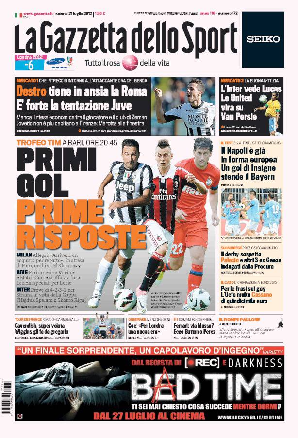 GAZZETTA TROFEO TIM – Sulla Gazzetta dello Sport si parla del Trofeo Tim di questa sera con Inter, Milan e Juventus impegnati nel famoso triangolare.