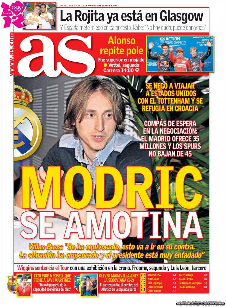 RASSEGNA STAMPA ESTERA AS – E’ sempre più calda la pista che porta Luka Modric al Real Madrid. Soprattutto perché c’è stata una vera e propria rottura fra il centrocampista e il Tottenham. Come si legge su AS, Modric si è rifiutato di partire con i compagni e con il nuovo allenatore Villas-Boas, rifugiandosi in Croazia. Il Real resta alla finestra.