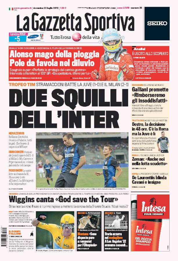 RASSEGNA STAMPA GAZZETTA DELLO SPORT – La Gazzetta dello Sport dedica la prima pagina all’Inter, fresca vincitrice del Trofeo Tim. Ieri sera, allo stadio San Nicola di Bari, la squadra allenata da Andrea Stramaccioni è riuscita a battere sia la Juventus che il Milan aggiudicandosi il consueto triangolare estivo.