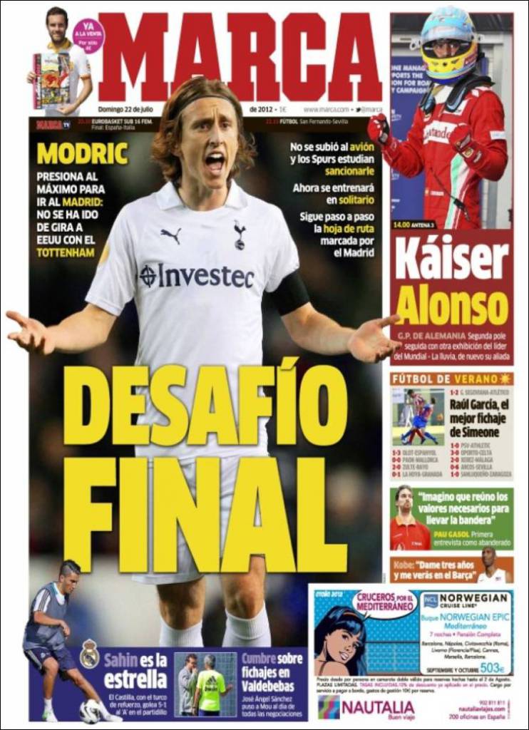 RASSEGNA STAMPA ESTERA MARCA – Anche Marca dedica la prima pagina alla vicenda che vede protagonista Luka Modric. Il centrocampista croato, finito da tempo nel mirino del Real Madrid, si è rifiutato di unirsi al ritiro del Tottenham. Ora il club londinese pensa a delle sanzioni per lui, ma Modric nel frattempo aspetta segnali da Madrid.
