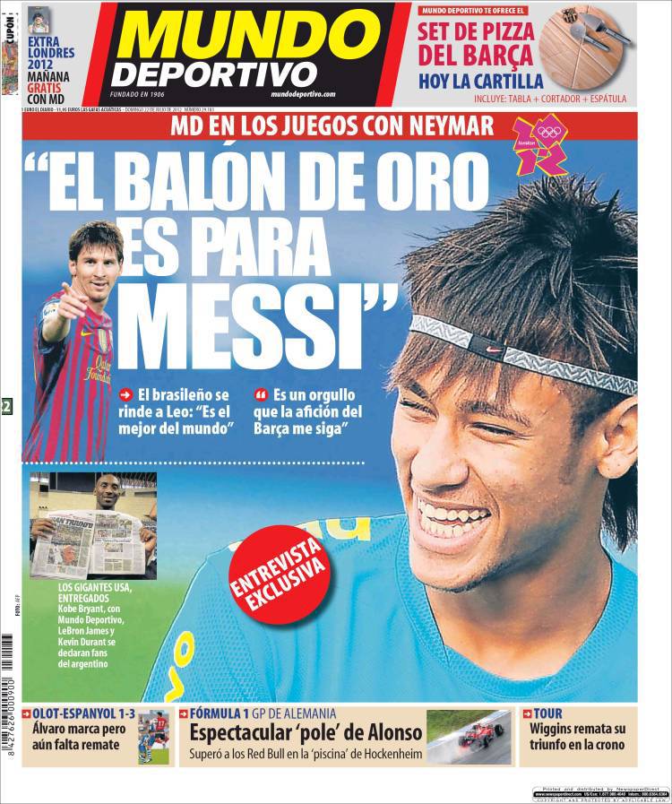 RASSEGNA STAMPA ESTERA MUNDO DEPORTIVO – Il quotidiano spagnolo Mundo Deportivo propone un’interessate intervista a Neymar. Il talentuoso attaccante del Santos e della nazionale brasiliana riempie di elogi Leo Messi: “Si merita il Pallone d’Oro. E’ il migliore del mondo“. Neymar si dice poi orgoglioso del fatto che un club come il Barcellona abbia mostrato interesse nei suoi confronti.