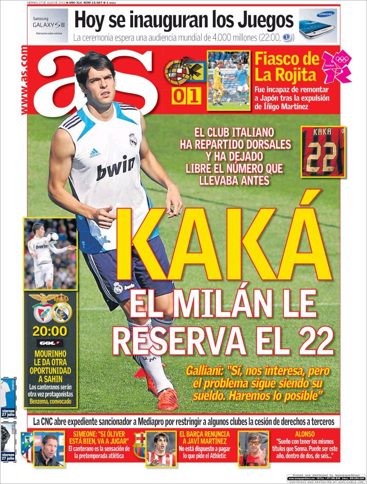 AS KAKA’ MILAN – Anche il quotidiano As parla del Milan che gli riserva il 22.
